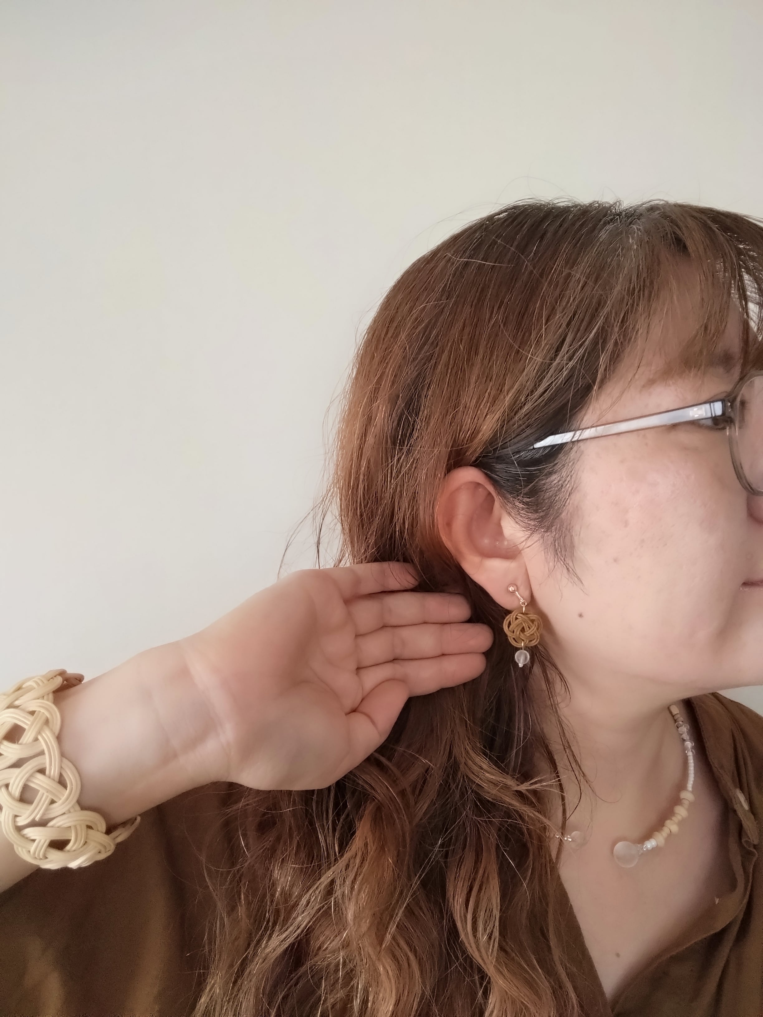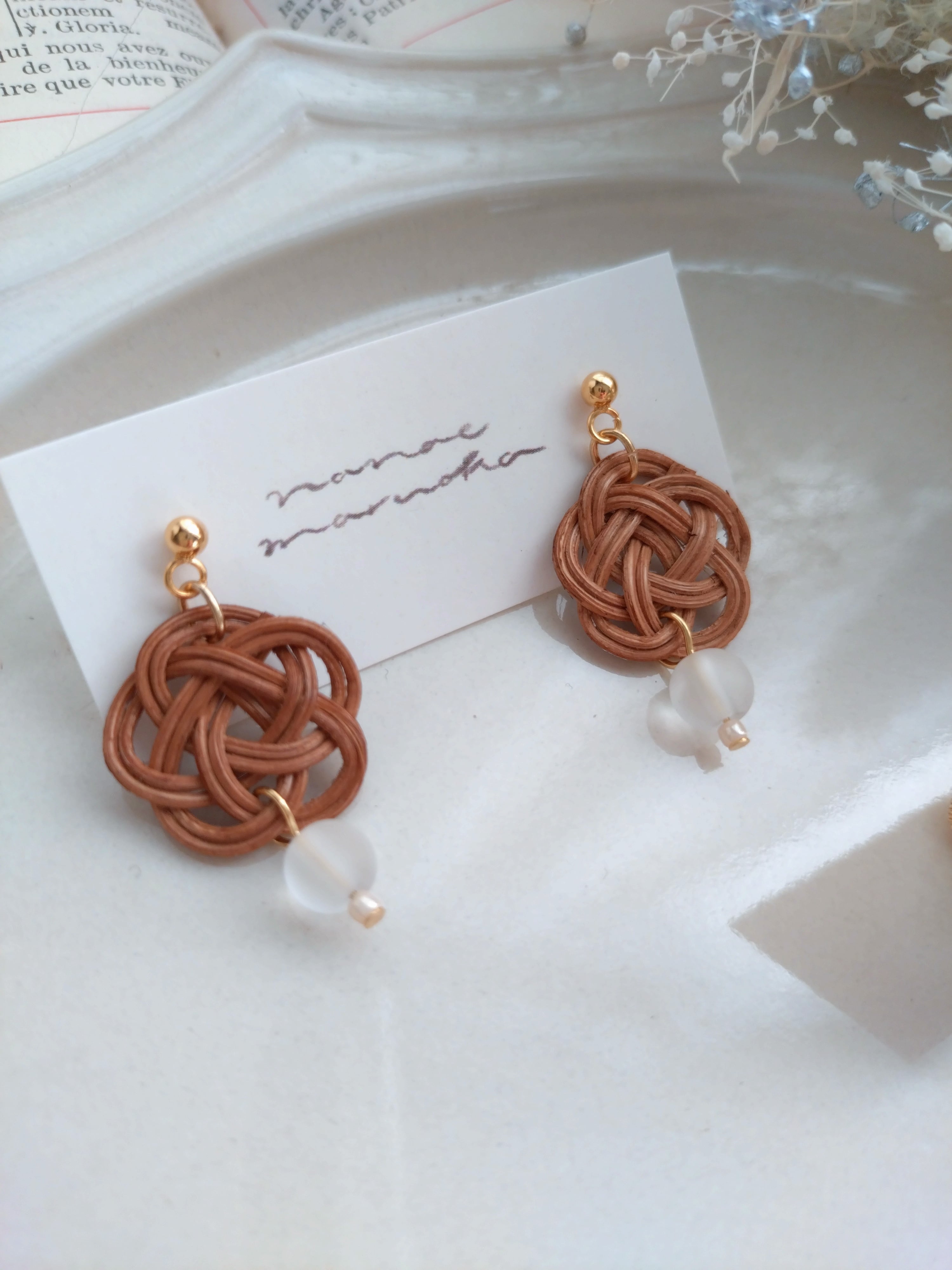 かご編みなどに使う籐(ラタン)を結って作った耳飾りです